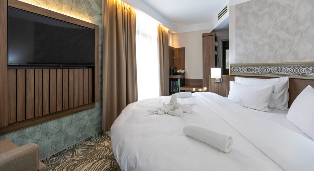 Elegáns, franciaágyas szoba, teljes körű felszereltséggel a zavartalan pihenésért.